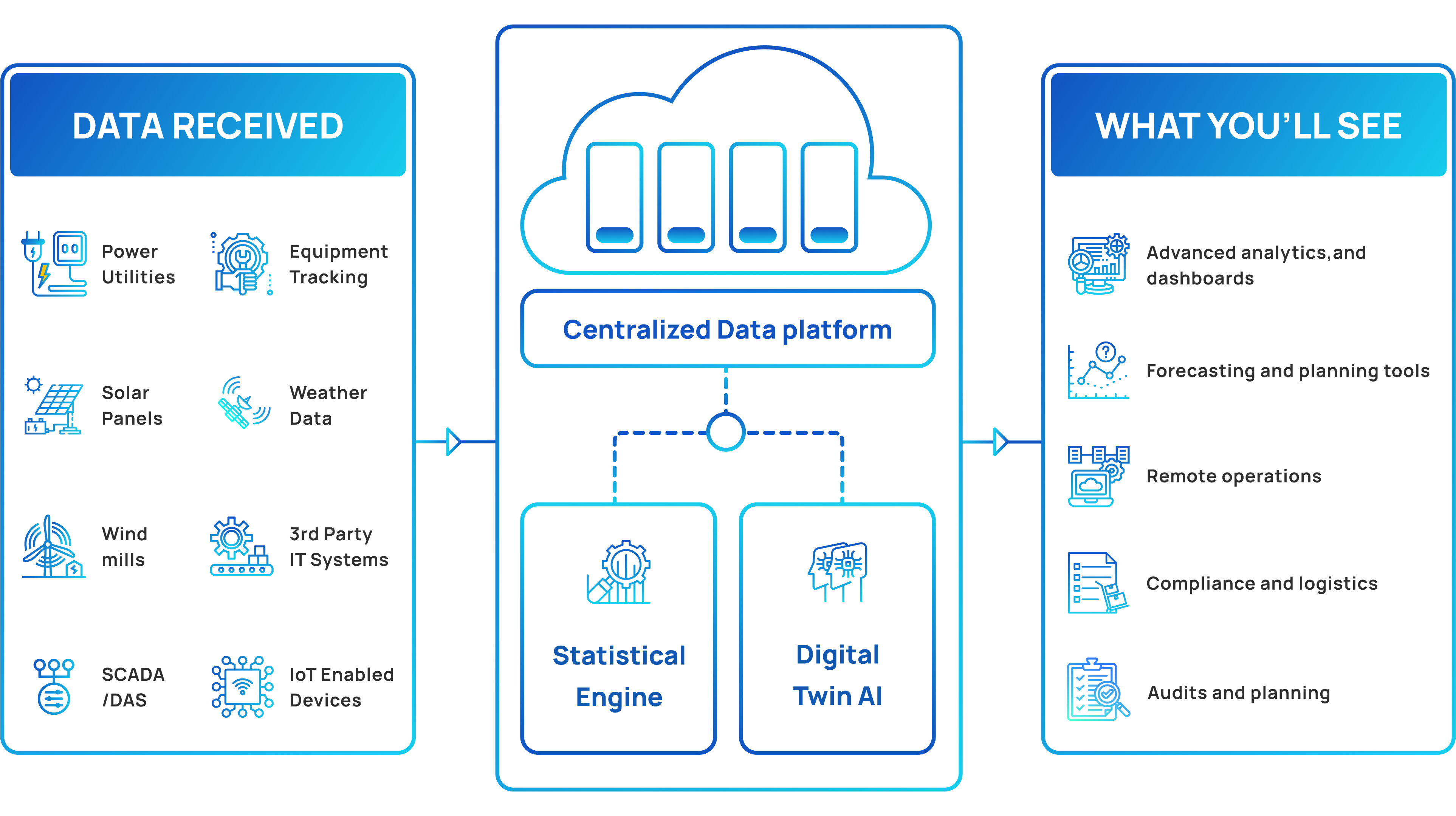 • Operating data gathered from SCADA/DAS, IoT devices, weather forecast providers etc.
